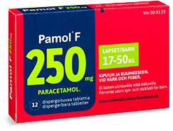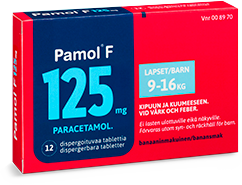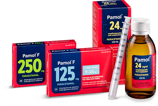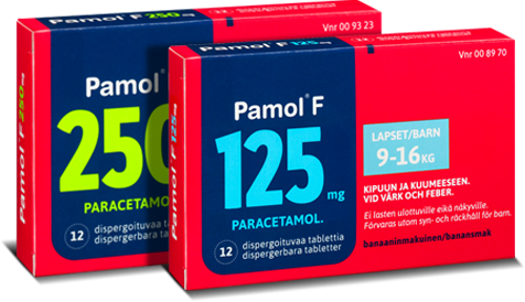 Pamol® F (125 mg ja 250 mg) on lapsille tarkoitettu kipu- ja kuumelääke, joka on kätevä ottaa, maistuu banaanilta ja sulaa suuhun. Niille lapsille, jotka eivät vielä voi käyttää Pamol® F -tabletteja, sopii nestemäinen Pamol®. Sen maku on hedelmäinen, ja pakkauksessa tulee mukana kätevä annostelumitta.
